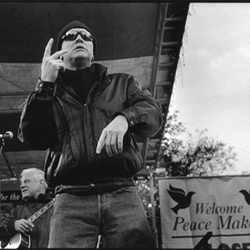 man with bushy hair and cap standing on street with signs "End the War..." and "Veterans for Peace"