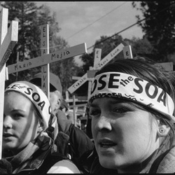 two women, with headbands "Close the SOA," in crowd outdoors with inscribed crosses