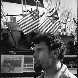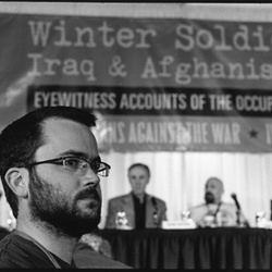 bearded man in cap, with sweatshirt with text "Iraq Veterans Against the War"; stone arch in background