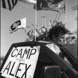 man in back seat of vehicle, outdoors, with sign "Camp Alex," flags and crutches in background