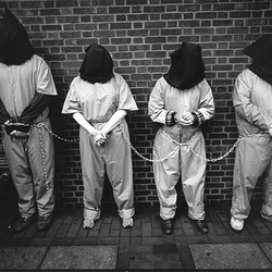 four people lined up against outside brick wall, wearing jumpsuits, heads covered in black hoods, chained together