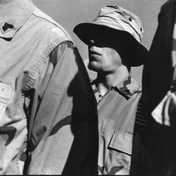 man with head shaded by hat, outdoors; Veterans Against the War shirts in foreground