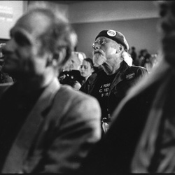 crowd seated indoors; focus on person from back, wearing t-shirt with text "Iraq Veterans Against the War"