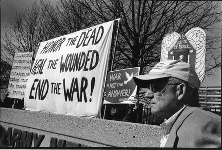 man in cap; signs "Honor the Dead...." "War Is Not the Answer" etc.