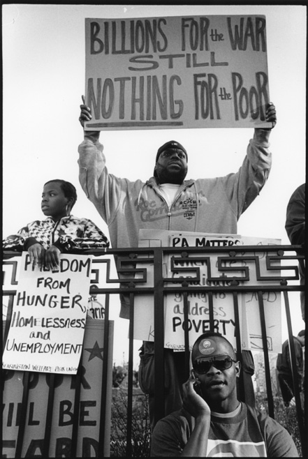 boy and man behind fence, with signs "Freedom from Hunger..." and "Billions for the War. Still Nothing for the Poor."