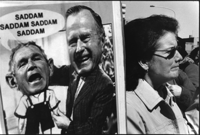 woman on right; on left cartoon of George Bush Sr. and George Bush Jr. saying "Sadaam...."