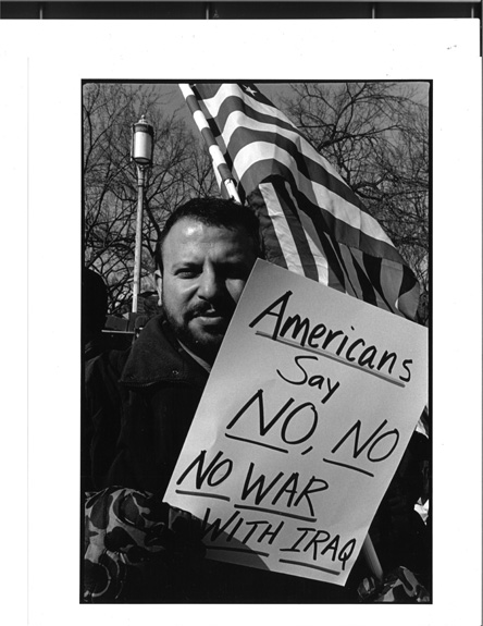 Man outdoors in front of an American flag, holding sign "Americans Say No, No, No War With Iraq."