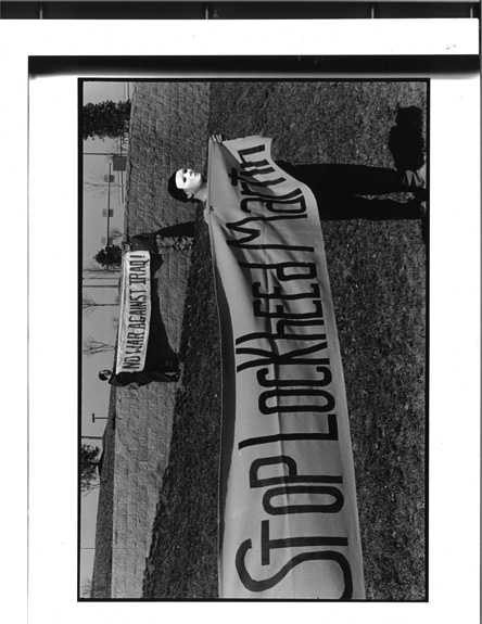 Banner outdoors "Stop Lockheed Martin" held by white-masked person; in background two holding banner "No War Against Iraq."