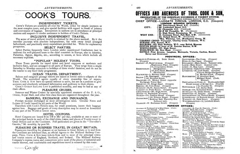 Thomas Cook (1808-1892) was born in England and gained notoriety for helping to pioneer a “new form of travel,” one which arguably formed the basis for tourism as it is understood in the modern day (Hunter, 30). In the early to mid 19th century, a desire for leisure time developed among the middle and working classes. Cook, a “cabinet-maker and Baptist preacher,” that he could use a democratization of travel to promote morality, specifically, temperance; he was additionally “committed to the idea that travel could widen a person's horizons, increase knowledge, and break down barriers of class, nationality, and gender” (30). The first large-scale Cook tour was to the London Crystal Paris Exhibition in 1851, but the Cook organization quickly expanded throughout Europe. John Mason, Cook’s son, joined the enterprise to help manage growing demand. In 1869, Cook launched his “Grand Tour of Egypt and Palestine/Syria,” and Cook hoped to “bring the age of mass, inexpensive travel to yet another region of the world”(31-32).