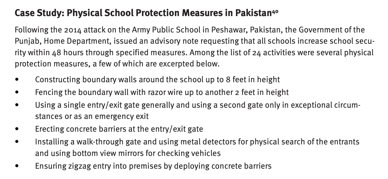 In the case of an attack, the GCPEA recommends that NGOs transfer their students and faculties to other schools, considering the cost of transportation. Students and teachers are instructed to return after schools have been deemed safe to return. Below is a case study of Army Public School in Peshawar, Pakistan, and their response to an attack.